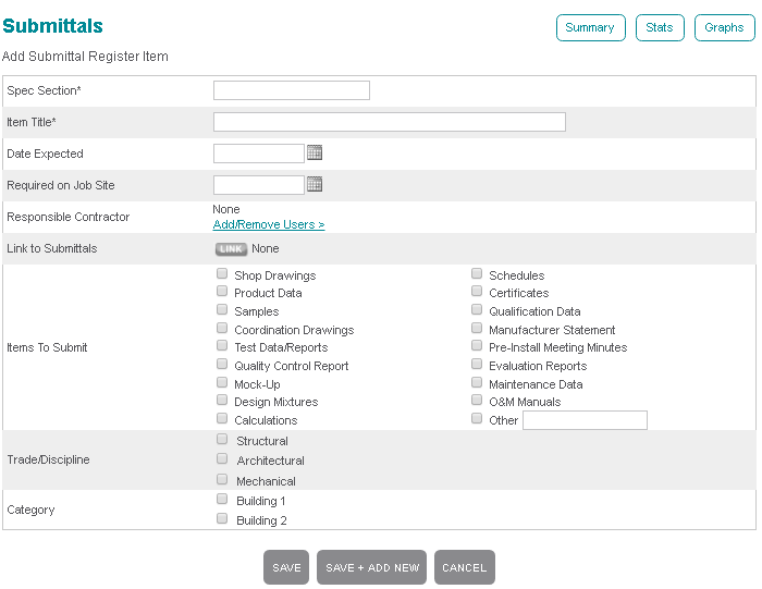 2. On the Add Submittal Register Item page, enter the Spec Section and Item Title.